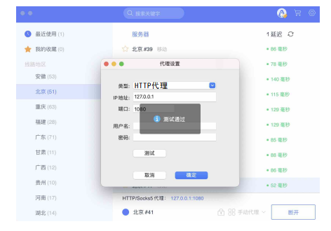 5. 点击测试,出现“测试通过”表示代理设置成功。之后返回登录页面即可登录使用QQ。